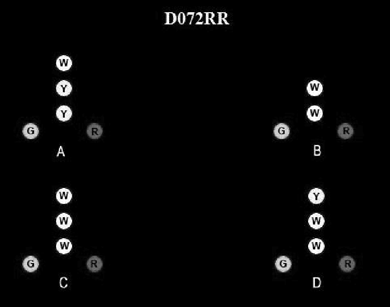 231. BOTH INTERNATIONAL & INLAND Which display of lights shown in illustration D072RR below indicates a dredge underway and not dredging?