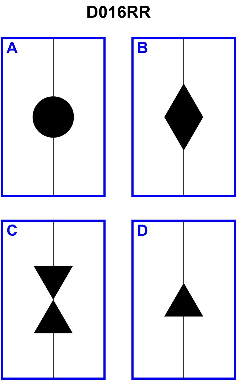 666. BOTH INTERNATIONAL & INLAND You are on a vessel engaged in fishing, other than trawling, and have gear extending more than 150 meters horizontally from the vessel. Which of the shapes shown in illustration D016RR below must you show in the direction of the outlying gear?