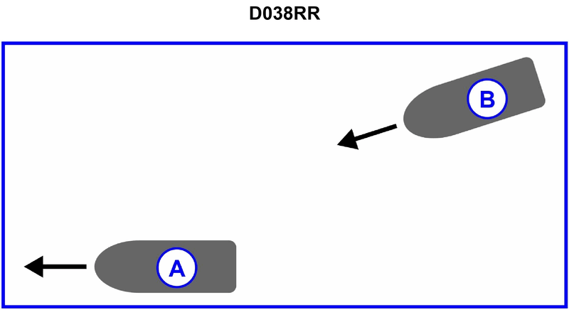 67. INLAND ONLY You are on power-driven vessel «A» and power-driven vessel «B» desires to overtake you on the starboard side as shown in illustration D038RR below. After the vessels have exchanged one blast signals what action should you take?