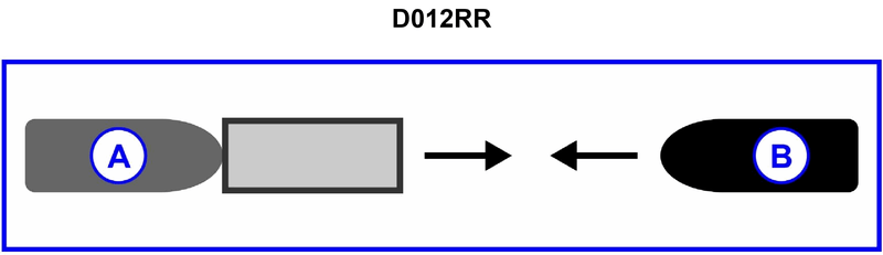 718. BOTH INTERNATIONAL & INLAND You are on vessel "A" pushing a barge ahead and meeting vessel "B" as shown in illustration D012RR below. How should the vessels pass?