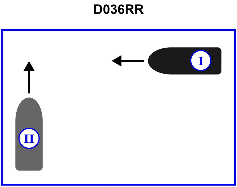 72. INLAND ONLY You are on a power-driven vessel «I» as shown in illustration D036RR below. Vessel «II» is a power-driven vessel engaged in fishing that will pass within 1/2 a mile of your vessel. You sound one short blast on the whistle. Vessel «II» does not sound any signal. Which action should you take?