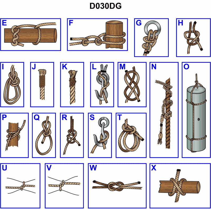 910. Which knot shown in illustration D030DG below represents a square knot?