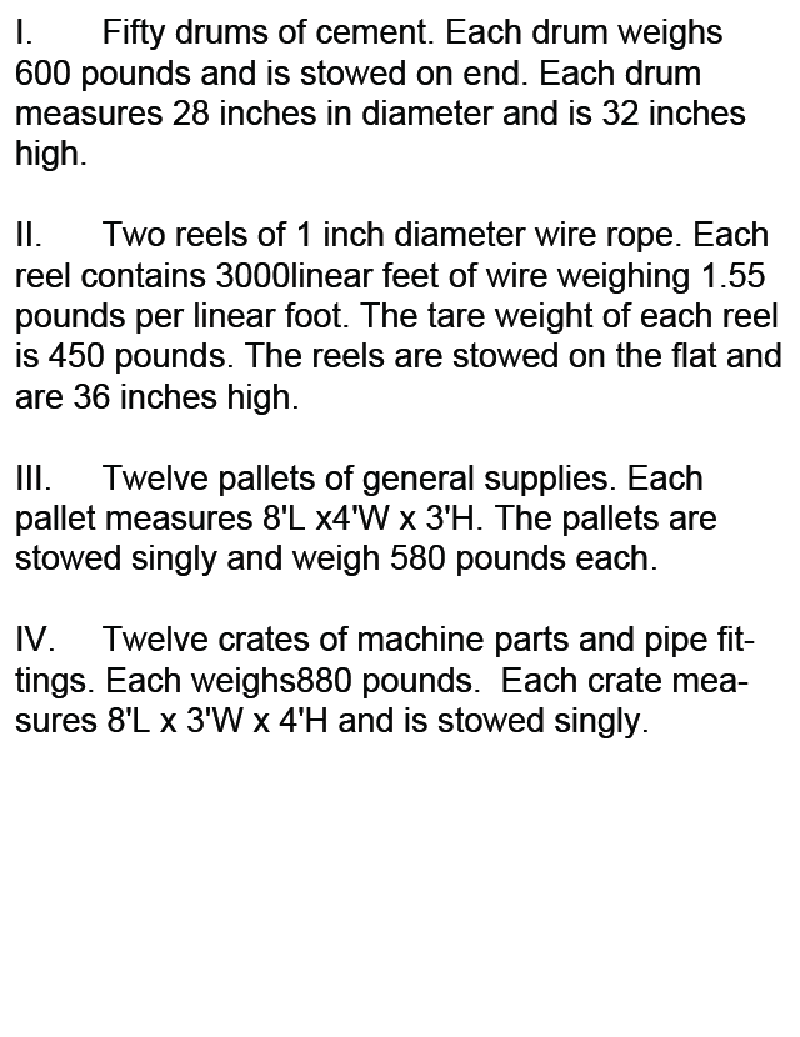 125. You are on a supply run to an offshore drilling rig. You are carrying the load show in table ST-0015 below. What is the height above the main deck of the center of gravity of the cargo?
