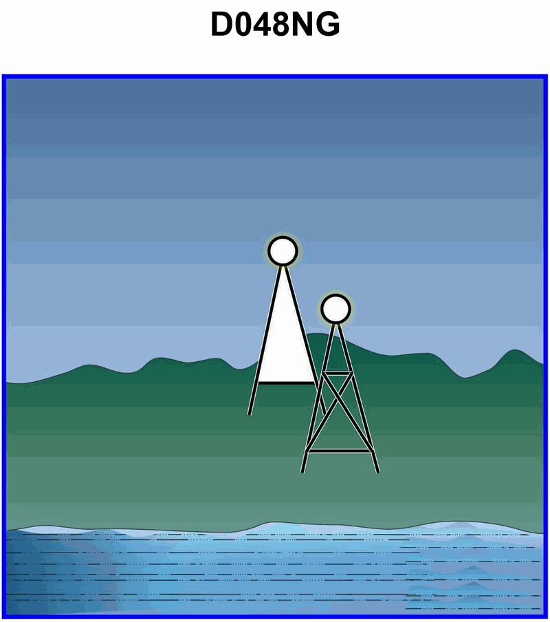 1104. Your vessel has changed course and is heading 285°T, you are on the charted range and it appears as in illustration D048NG below. After several minutes the range appears as in illustration D047NG below and your heading is still 285°T. What does this indicate?