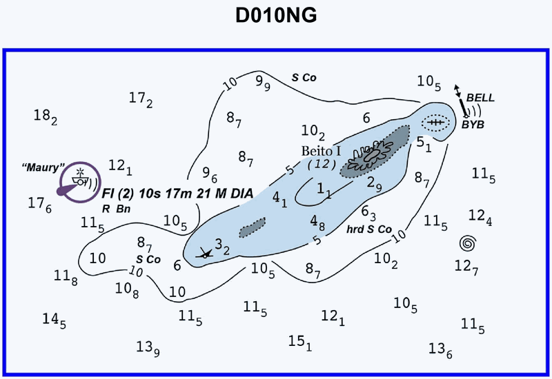 920. Which statement concerning the chartlet in illustration D010NG below is true? (Soundings and heights are in meters)