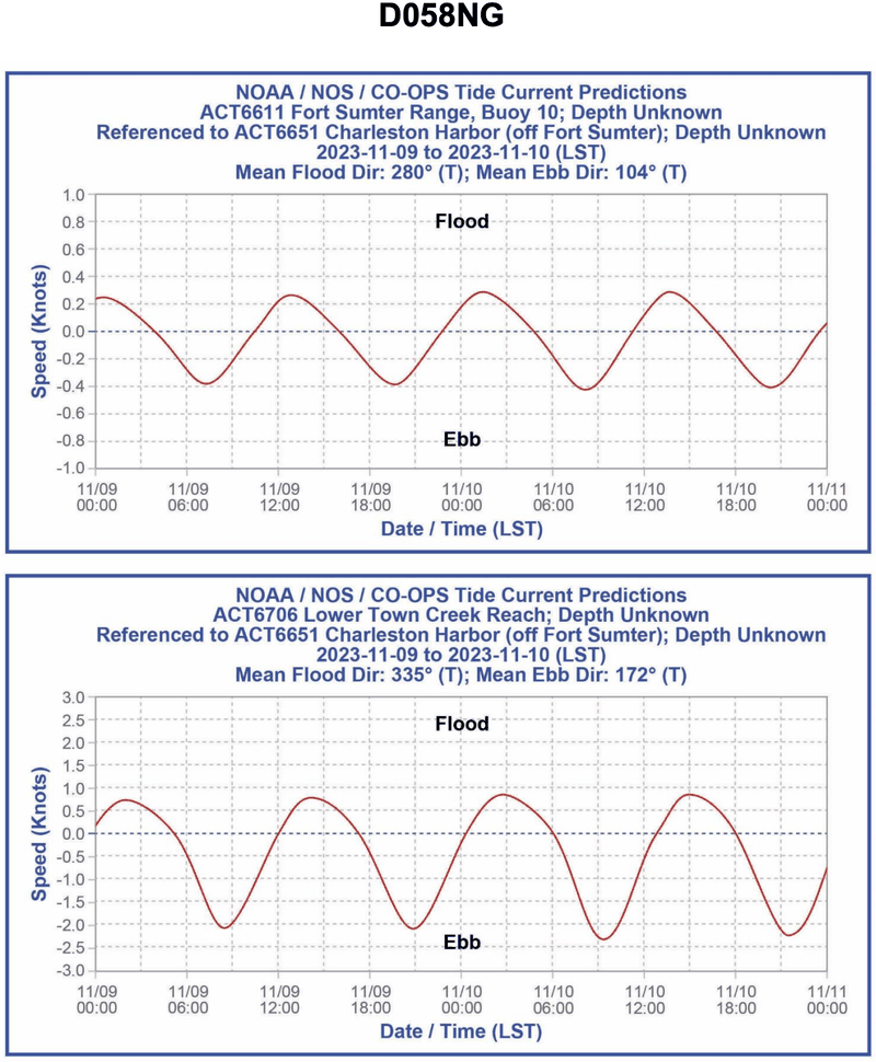 461. On 9 November 2023 at 1130, you are inbound at Charleston Harbor Entrance Buoy “10” (ACT6611). Your vessel will transit 15nm and make good 10.0 knots to a berth where the nearest tidal current station is ACT6706. What will be the direction and velocity of the current as you approach the dock