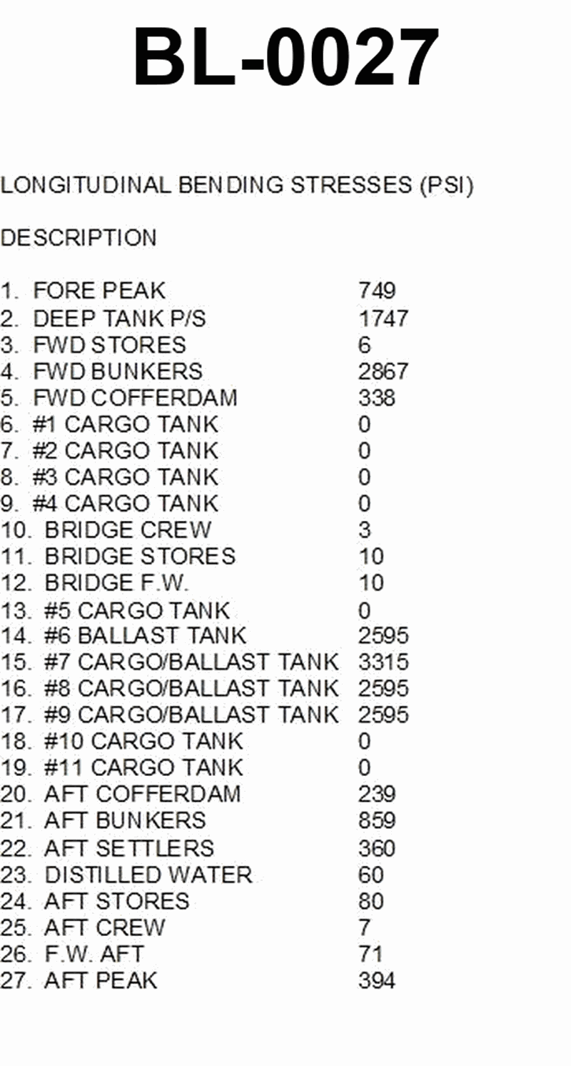 2043. The tankship Northland is loaded as shown in table BL-0027 below. Use the salmon colored pages in the Stability Data Reference Book to determine the sagging numeral.