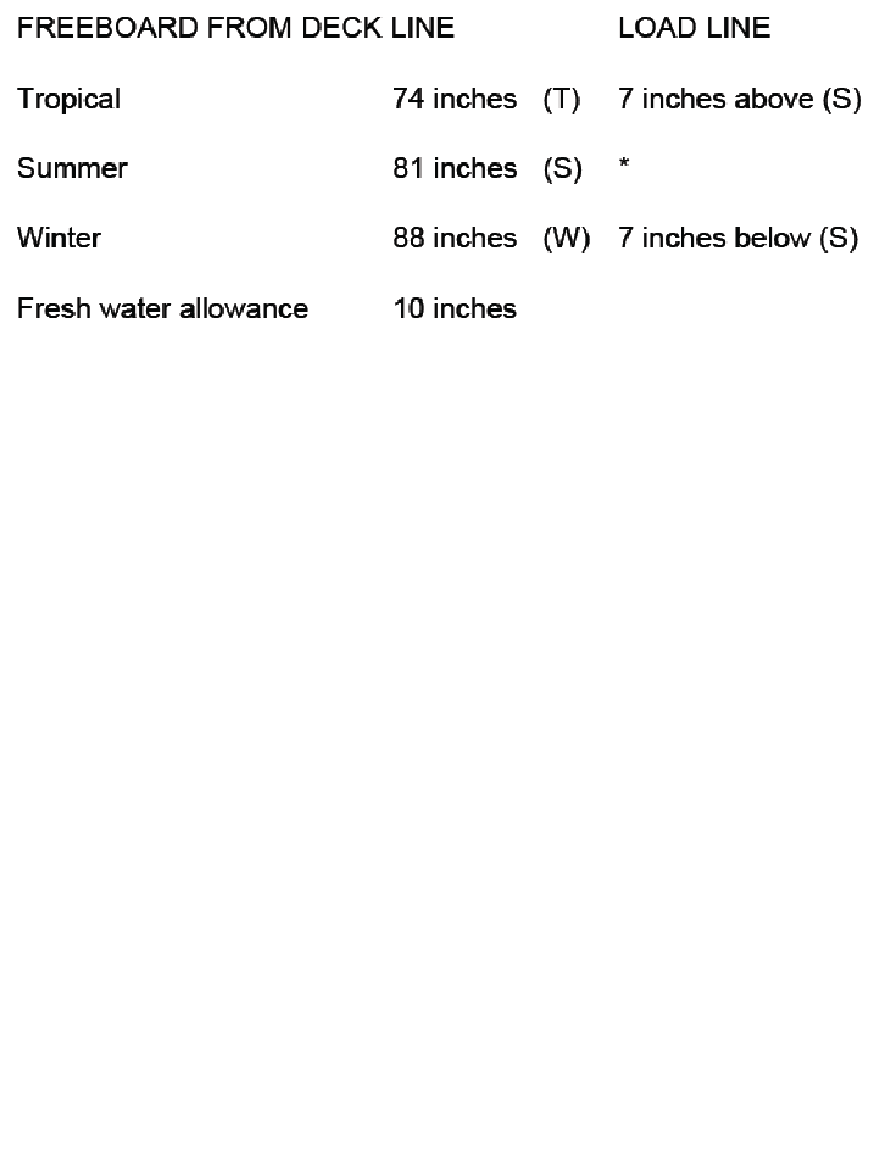76. You are loading in a port subject to the tropical load line mark and bound for a port subject to the winter load line mark. You will enter the summer zone after steaming one day, and you will enter the winter zone after a total of eight days. You will consume 36 tons of fuel, water, and stores per day. The hydrometer reading at the loading pier is 1.002, and the TPI is 47. What is the minimum freeboard required at the start of the voyage? Reference Table BL-0005 below.