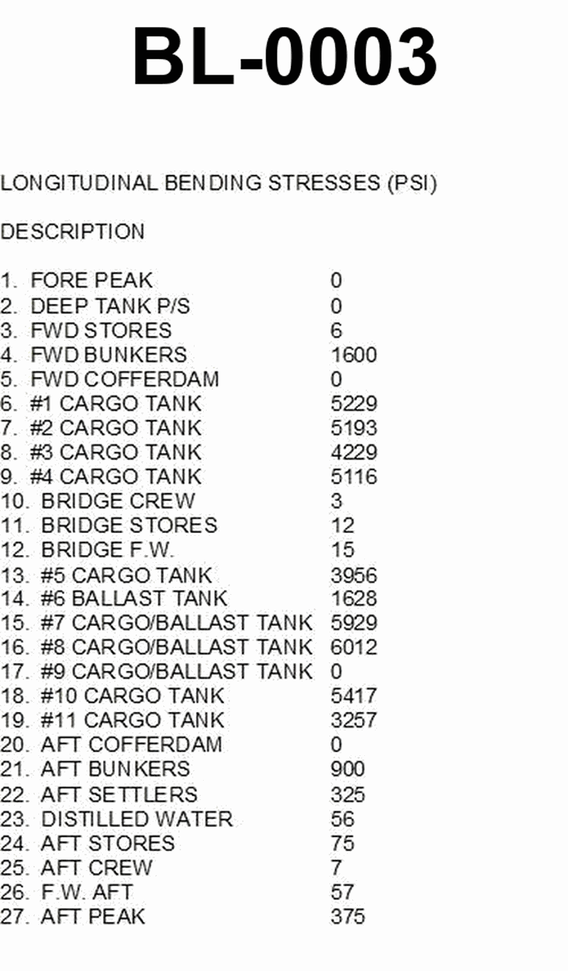 1506. The tankship Northland is loaded as shown in table BL-0003 below. Use the salmon-colored pages in the Stability Data Reference to determine the sagging numeral.