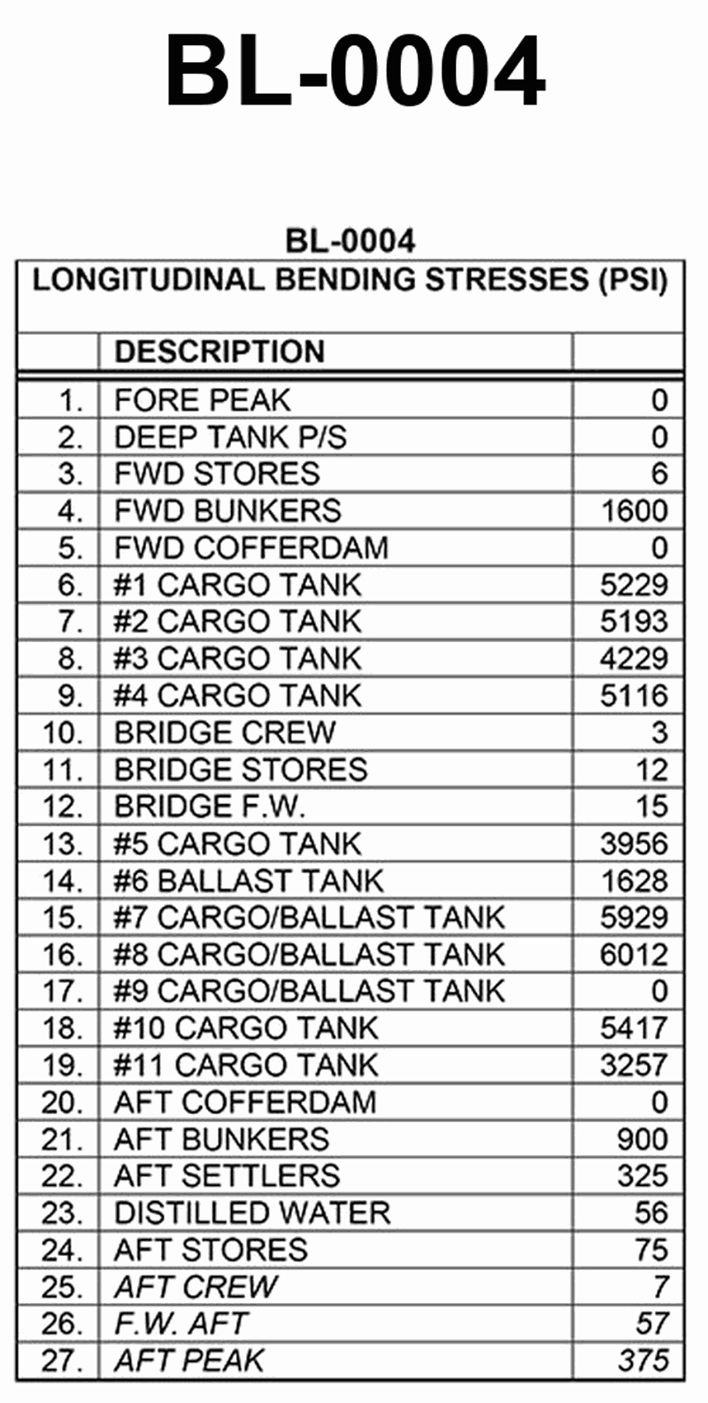 1507. The tankship Northland is loaded as shown in table BL-0004 below. Use the salmon-colored pages in the Stability Data Reference Book to determine the hogging numeral.