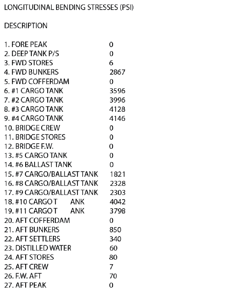 1508. The tankship Northland is loaded as shown in table BL-0028 below. Use the salmon-colored pages in the Stability Data Reference Book to determine the sagging numeral.