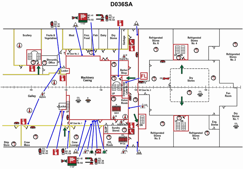 2140. In illustration D036SA below, what does the solid arrow in the Crew Mess represent on the Fire Control Plans?