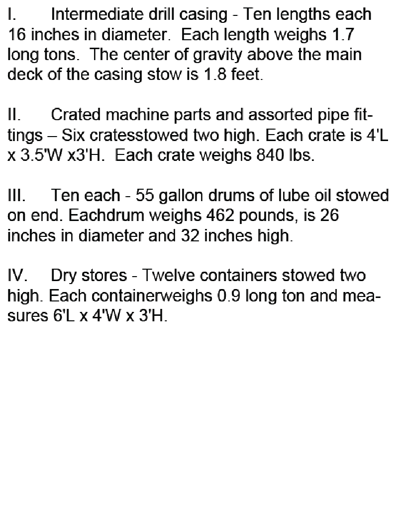 136. You are on a supply run to an offshore drilling rig. You are carrying the load show in table ST-0030 below. What is the height above the main deck of the center of gravity of the cargo?