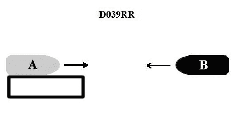 750. BOTH INTERNATIONAL & INLAND You are on vessel "A" towing a barge alongside and meeting power-driven vessel "B" as shown in illustration D039RR below. Which action should you take?
